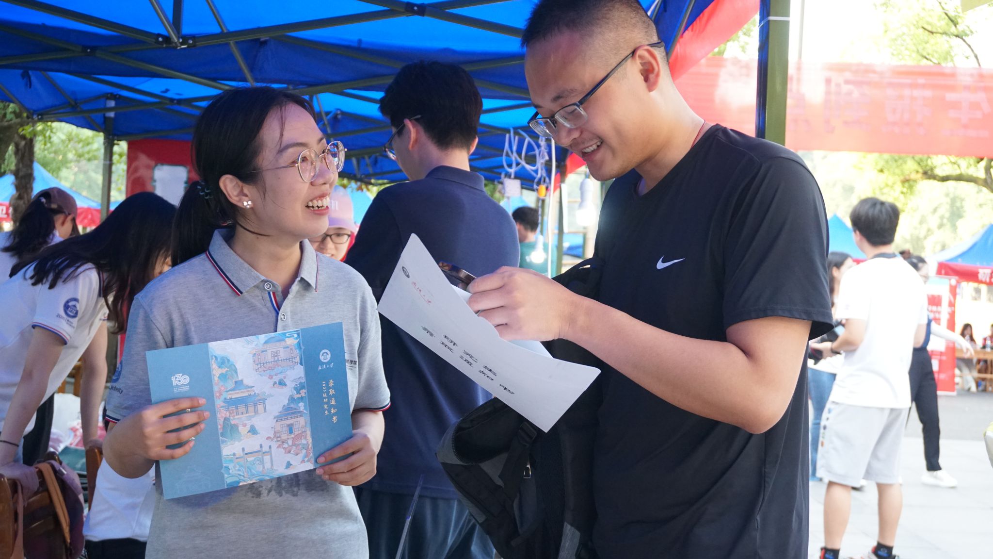 2023级研究生迎新报到工作在信息学部图书馆门前的报道点有条不紊地展开。在志愿者们的指引下,新生们准备好录取通知书和其他身份证明。志愿者仔细核验每位新生的报到材料,发放校园卡和新生纪念品大礼包,为新生和家长提供细致温暖的服务。